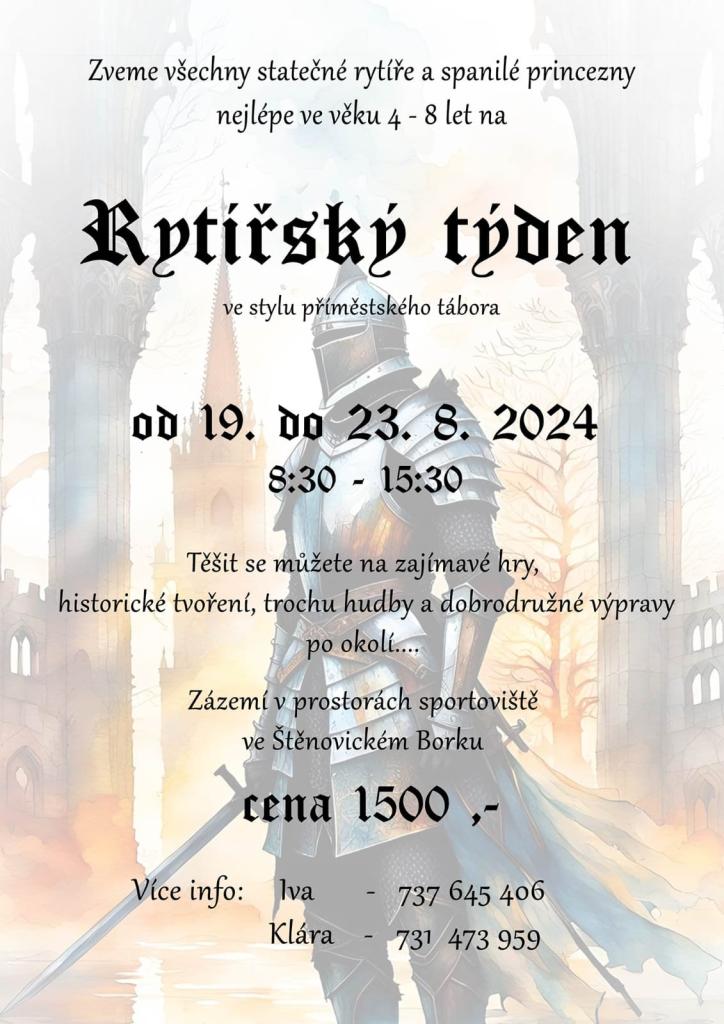 Rytířský týden ve stylu příměstského tábora od 19.-23.8.2024 v čase 8:30-15:30 pro všechny statečné rytíře a spanilé princezny nejlépe ve věku 4 - 8 let. Zázemí bude v prostorách sportovního areálu ve Štěnovickém Borku. Cena 1500 Kč. Kontakty: 737645406, 731473959.