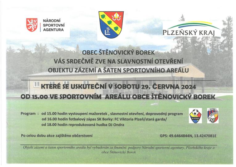Slavnostní otevření objektu zázemí a šaten sportovního areálu se uskuteční v sobotu 29. června 2024 od 15:00 ve sportovním areálu Štěnovický Borek