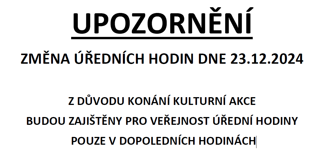 Z DŮVODU KONÁNÍ KULTURNÍ AKCE BUDOU ZAJIŠTĚNY PRO VEŘEJNOST ÚŘEDNÍ HODINY POUZE V DOPOLEDNÍCH HODINÁCH